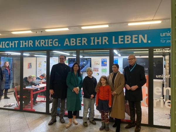Hintergrund ist eine von Unicef angeregte Aktion, um auf den Alltag von ukrainischen Kindern während des Krieges aufmerksam zu machen. Mit der Unterstützung der BVG hat Unicef ein provisorisches Klassenzimmer im U-Bahnhof errichtet. Ein Ort, an dem täglich hunderte Menschen vorbeilaufen. Bis zum 21. Dezember wird das Klassenzimmer dort zu sehen sein, gibt Unicef an.