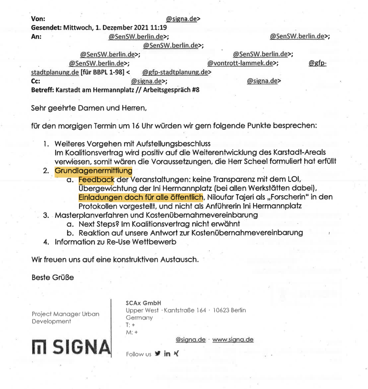 Nach der hitzigen Veranstaltung meldete Signa an die Senatsverwaltung, dass Gesprächsbedarf bestand. Kritisch sah das Unternehmen in der Nachricht vom 1. Dezember 2021, dass die „Einladungen doch für alle öffentlich“ waren. Außerdem sei die kritische Bürgerinitiative übergewichtet, bemängelte Signa. Das Unternehmen fragte auch nach den „Next steps“, es schien ihm nicht zu reichen, was zu dem Projekt im Koalitionsvertrag von SPD, Grünen und Linken stand.