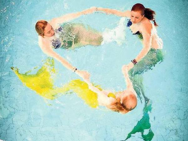 Die sechs Seejungfrauen mit ihren pinken, blauen, gelben und türkisen Flossen ziehen die Blicke aller Badegäste auf sich. Am Ende der Stunde sind sie ziemlich erschöpft. Wenn eine Meerjungfrau dann elegant in die Tiefe abtaucht und dabei mit ihrer Flosse schelmisch aufs Wasser platscht, heißt das übrigens: Tschüss!