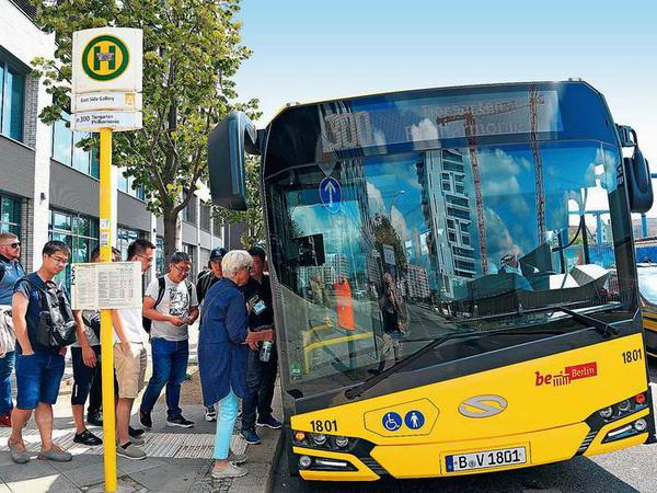 Hat man sonntags noch nichts vor, kann so eine Busfahrt durch die eigene Stadt ein schöner Zeitvertreib sein und das persönliche Koordinatensystem festigen. Die Verwaltungsangestellte aus Reinickendorf – graue Haare, rosa Bluse, so mittelalt – hat sich extra die Mühe gemacht, an die Warschauer Straße zu fahren, um von dort auf der nagelneuen Linie 300 eine Premierenfahrt an die Philharmonie zu unternehmen. „Es gab ja viele Änderungen in letzter Zeit. Das möchte ich einfach mal so verinnerlichen.“ Erwartungsvoll schaut sie zu den Bussen, die sich unter der Brücke versammelt haben, darunter viele neue Elektrobusse mit abgerundetem Dach. Das sind die neuen „E-Citaro“ von Mercedes. Die 300er-Linie soll den Touristen zeigen, dass Berlin seine Luft sauber hält.