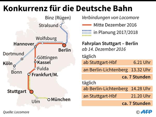 Im Fernverkehr hat die Deutsche Bahn vor allem Konkurrenz auf der Straße. Doch neben den Fernbussen versuchen auch Verkehrsunternehmen auf der Schiene, dem Konzern Paroli zu bieten. Am Mittwoch startet der erste Fernzug von Locomore - einem Anbieter, der sich per Crowdfunding eine Basisfinanzierung von gut einer halben Million Euro gesichert hat. Damit hält nach vielen Jahren wieder tagsüber ein Fernzug am Bahnhof Zoo – und zwar um 12.59 Uhr (aus Stuttgart) und um 15.01 Uhr (nach Stuttgart). Nachts hält dort auch ein IC der Bahn. Die Fakten: