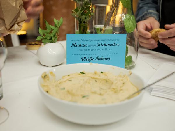 Hummus gab es am Abend der Preisverleihung natürlich auch: Caterer eßkultur hatte zehn verschiedene Sorten Hummus – mit Bohnen, Erbsen, Roter Bete, Ingwer, Granatapfel – auf den Stehtischen platziert. Jeder wollte alles probieren und kam so auch mit allen ins Gespräch: der praktische Beweis für die verbindende Kraft des Essens.