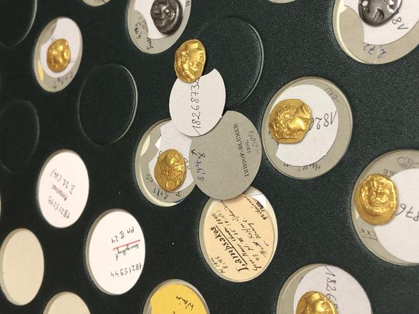 „Von den meisten Münzen kennen wir heute den Vorbesitzer“, sagt Weisser. Im Tresorraum der Sammlung zieht er eine Lade auf, in dem sich Münzen der antiken Stadt Lampsakos befinden. Unter einer Goldmünze lugt ein grauer Zettel hervor. „Imhoof-Blumer 1900“ steht darauf. „Das bedeutet, dass das Münzkabinett die Münze von dem Schweizer Numismatiker Friedrich Imhoof-Blumer aus Wintherthur im Jahr 1900 erworben hat“, sagt Weisser. Darunter findet sich ein weiterer, kleiner Zettel, auf dem noch Angaben zur Münze in der kleinen, zierlichen Handschrift des Schweizer Münzkundlers zu finden sind.