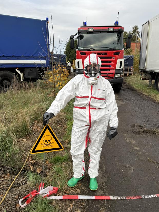 Im Schutzanzug und Gasmaske in die „Chemie-Hölle“. Der Einsatz in der nach Chemikalien stinkenden Halle war nicht ungefährlich. Unterstützung kam vom Katastrophenschutz der freiwilligen Feuerwehren Havelland und Märkisch-Oderland, Chemikern des Bildungs- und Wissenschaftszentrums sowie dem Technischen Hilfswerk.