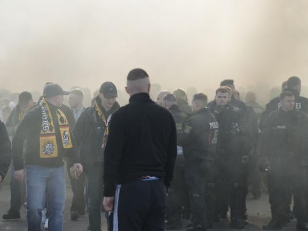 Vor dem Südeingang des Stadions warten tausende Dynamofans. Einige Angereiste rätseln, wo denn der Eingang ist – den kann man nämlich von den hinteren Reihen aus nicht erkennen. Die Polizei ist mit zahlreichen Kräften vor Ort, auch Wasserwerfer-Fahrzeuge sind zu sehen. Einige Fans zünden Rauchbomben.