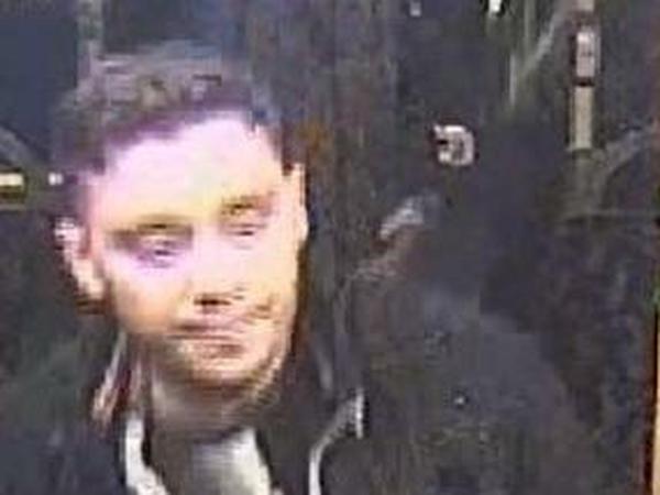 · trug eine schwarze Jacke, eine dunkle Hose, weiße Turnschuhe mit dunkler Umrandung an den Sohlen, einen dunklen Pullover mit senkrecht, wellenförmig verlaufenden weißen Streifen