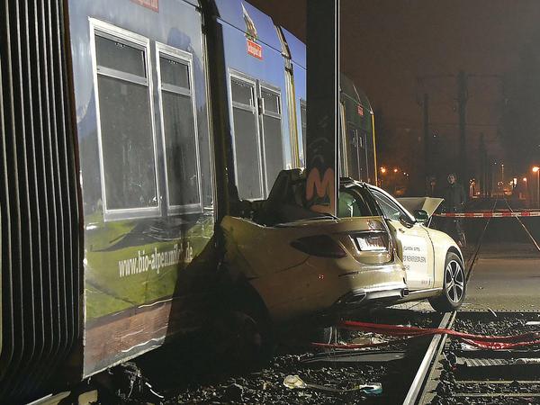 Bei der Kollision mit einer Tram wird ein Taxi gegen einen Mast gedrückt und dabei zerquetscht. Der 49-jährige Autofahrer kommt ins Krankenhaus.
