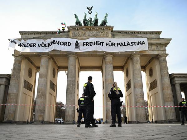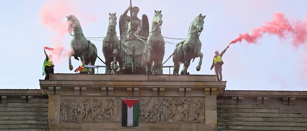 Einsatz am Brandenburger Tor in Berlin-Mitte: Mehrere Demonstranten sind am Donnerstag auf das Denkmal geklettert und haben ein propalästinensisches Transparent aufgehängt. Die Polizei sprach von drei Aktivisten, die mit einer Hebebühne auf das Tor gelangt seien. Auf dem Banner war zu lesen „Nie wieder Völkermord – Freiheit für Palästina“. Auch eine Palästina-Flagge ist auf Bildern der Agentur Reuters zu sehen.
