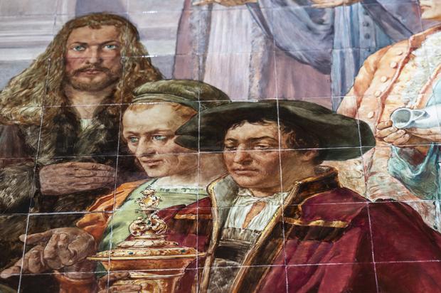 Hinter der Figur sind die Türme des Kölner Doms zu sehen. Außerdem malten die KPM-Künstler Persönlichkeiten aus Kunst und Wissenschaft auf die Kacheln, darunter den Maler Albrecht Dürer, den Philosophen Gottfried Wilhelm von Leibniz und den Buchdrucker Johannes Gutenberg.