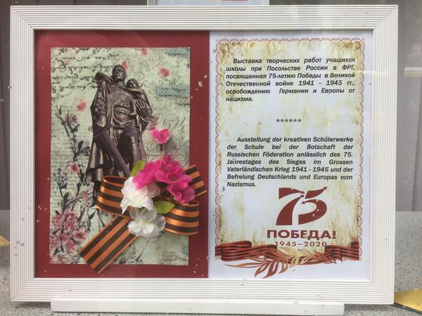 Eine Schaufensterausstellung von Schülern der russischen Botschaftsschule erinnert an den 75. "Tag des Sieges" im ehemaligen Aeroflotbüro
