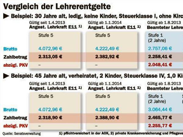 Berlin verbeamtet Lehrer seit 2004 nicht mehr. Inzwischen gibt es in Berlin rund 9000 angestellte Lehrer, das entspricht etwa einem Drittel der Pädagogen. Seit 2009 zahlt Berlin angestellten Lehrern eine Zulage, so dass sie schon bei Berufseinstieg das für ihre Ausbildung höchstmögliche Gehalt bekommen, also in die höchste Einkommensstufe (Erfahrungsstufe 5) eingruppiert werden. Dies führt zu relativ hohen Einstiegsgehältern. Ein Lehrer mit einem Wahlfach (für die Klassenstufen 1 bis 10, oft sind dies Grundschullehrer) verdient 4072 Euro brutto (siehe Grafik), ein Gymnasiallehrer (Studienratslaufbahn) verdient 4600 Euro brutto. Dennoch verdienen angestellte Lehrer auf lange Sicht gesehen weniger als verbeamtete Pädagogen. Nach elf Jahren bekommt ein verbeamteter, kinderloser Grundschullehrer netto rund 100 Euro im Monat mehr als sein angestellter Kollege, nach 23 Jahren sind es 300 Euro mehr. Ein verbeamteter Studienrat überholt seinen angestellten Kollegen bereits nach acht Jahren. Nach 23 Berufsjahren verdient der Beamte im Monat 400 Euro netto mehr.