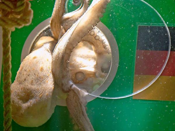 Der weibliche Krake Ophira steuerte am Freitag nach anfänglichem Zögern auf das deutsche Tor zu - ist dann sogar in das Tor geschlüpft.