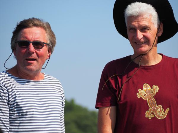Michael Wittke, ausgewaschene Jeans, weiß-blau geringeltes T-Shirt, wirft die Leinen los, dann klettert er auf die hinterste Heckplattform und ergreift den Knauf der langen grünen Ruderpinne. Rolf wirft den Diesel an, dann verschwindet er in der Kajüte am Heck und kommt als Smutje mit kühlen Getränken für die Gäste wieder heraus. Am liebsten stehen die Zwei mit ihren breitkrempigen, schwarzen Filzhüten aber nebeneinander barfuß an der Pinne wie einst die Freibeuter am Achterdeck und genießen durch dunkle Sonnenbrillen den Blick über ihren Kahn.