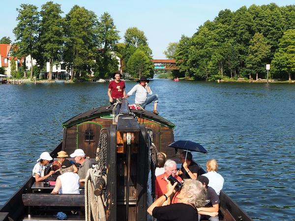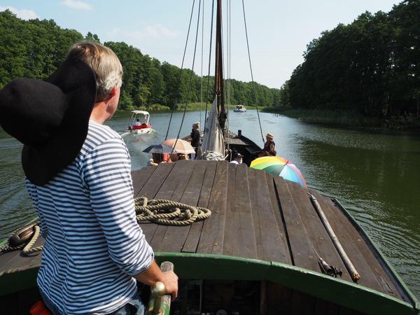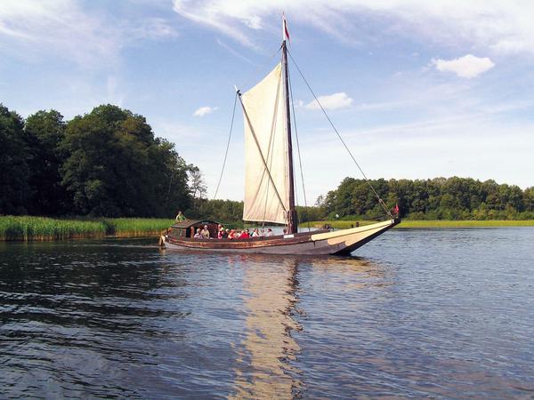Auf diesen Moment haben sich die 23 Passagiere besonders gefreut. Sie sind eine Geburtstagsgesellschaft. Aber nun gleiten sie wie einst die Besatzung der Kaffenkähne nur mit der Kraft des Windes dahin. Sie erleben eine maritime Zeitreise zurück ins 17. Bis 19. Jahrhundert. Ein außergewöhnliches märkisches Freizeitvergnügen.