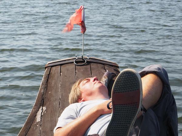 Frank legt sich gemeinsam mit Gerd ins Zeug. Gerd ist Potsdamer und Informatiker. Dreimal schlägt das Tuch hin und her, dann wölbt sich die Leinwand, der Kahn nimmt Fahrt auf, geht in die Schräge, Wasser plätschert am Bug.