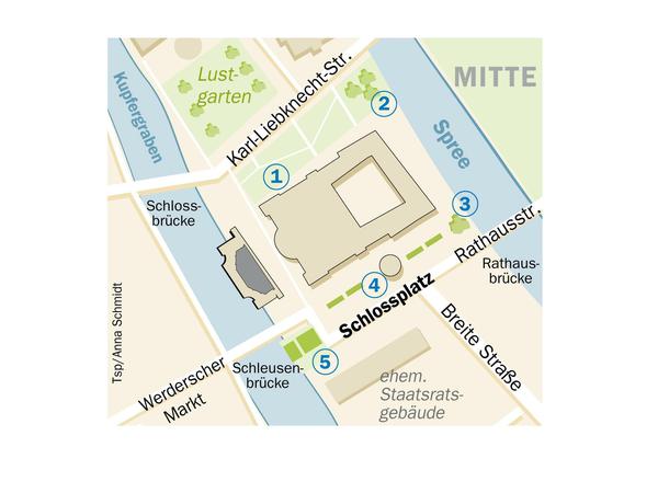 Genau an dieser Stelle, vor dem früheren Staatsratsgebäude, legen die Landschaftsarchitekten nun wiederum eine Baumgruppe an, die den historischen Gebäudekörper simulieren soll. „Abstrakt und akademisch“ sei das, so war aus dem Umfeld der Jury zu hören. Allerdings genügt es andererseits dem Anspruch, die historischen Spuren mit modernen Mitteln nachzuzeichnen.