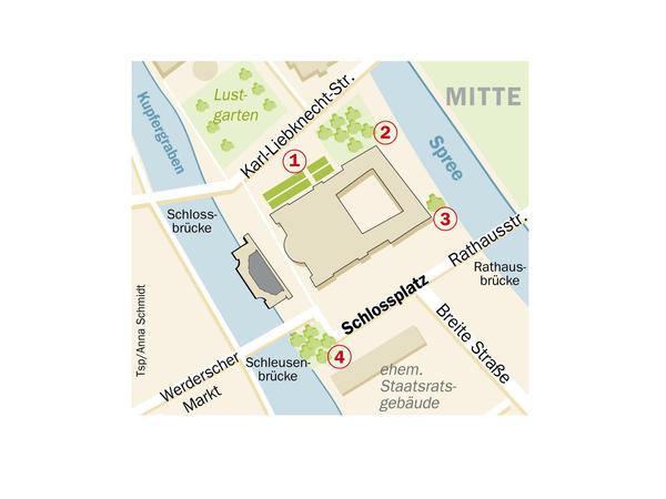 Ähnlich gehen sie im Südwesten der geplanten Schlüter-Rekonstruktion vor. Dort liegt der Schlossplatz, und dieser war bis zum Krieg durch Eckbauten eingefasst. Auf diesem – heute frei stehenden – Grundstück wollte Thyssen-Krupp ursprünglich einen Glaskubus errichten. Doch die umstrittenen Pläne hatte der Konzern im vergangenen Jahr aufgegeben, und das Baugrundstück war an das Land Berlin zurückgefallen.