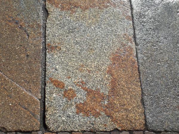 Beim Gang durch die Stadt begegnen einem die blankgelaufenen Großplatten mit ihren kleinen Ereignissen im Stein überall, besonders in historisch erhaltenen Straßenzügen. Die Platten werden zweireihig gegeneinander versetzt verlegt, sodass keine parallelen Längsfugen auftreten. Unter den Füßen breitet sich ein Farbspiel grauer oder warmgelber Oberflächen aus, bald ganz homogener, bald von vulkanisch wirkenden schwarzen Bändern oder von Wolken lebhafter Körnung durchzogener Exemplare. Normalerweise ist ihre Oberfläche blassgrau und stumpf. Doch verwandelt sie sich nach einem Regenschauer in einen glänzenden Spiegelboden: Da tritt die Maserung des Steins mit Macht zutage, zeigt sich, dass er in Wirklichkeit noch in viel feineren Schattierungen und Körnungen schimmert, rostrote Adern leuchten hell aus der Fläche.