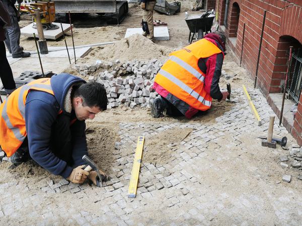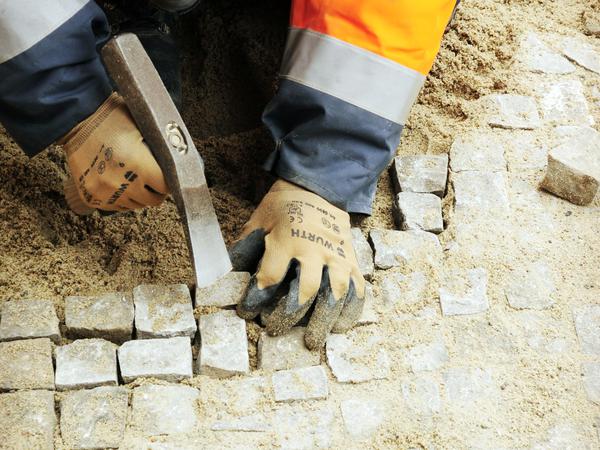Mike Wegner und Steffen Borchert, zwei Steinsetzer aus seiner Truppe, knien auf Gummischonern auf dem Gehweg. Sie sind ein eingespieltes Duo, wie von selbst wächst die Oberfläche der Steine unter ihren Händen. Ein ausgelernter Geselle schafft acht bis zehn Quadratmeter Mosaikpflaster pro Tag. Die Pflasterraupen, längliche Steinhäufchen, liegen so im Sand, dass die Männer nur den Arm ausstrecken müssen, um nach einem passenden Stein zu langen.