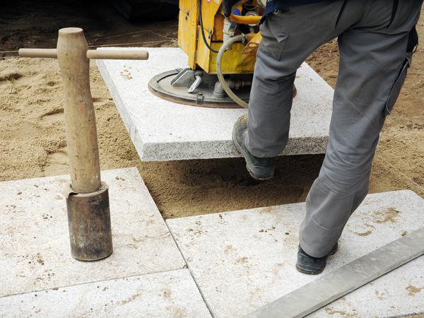 Wenige Meter neben den Pflasterern heben die Straßenarbeiter an einem Sommermorgen neue Granitplatten mit einem am Minibagger befestigten Sauggerät in die Plattenbahn. Die Granitplatte muss „satt liegen“ in ihrem Sandbett, sagt Petzoldt und meint damit: so stabil, dass sie nicht seitlich wegkippen kann, die Gehfläche plan bleibt. Damit das gelingt, nimmt der Arbeiter von der Mitte des Sandbetts, in das sie eingelassen werden soll, eine oder zwei Schaufeln Sand weg. Den Rest macht die schwere Platte selbst, deren Gewicht den Sand von der Mitte wegdrückt.