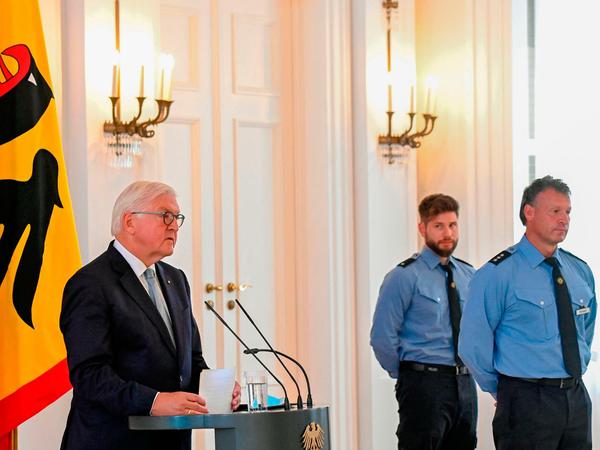 Der Bundespräsident würdigt die Beamten, die beherzt am Reichstag eingriffen. Sie arbeiten sonst in einem Abschnitt, wo knifflige Einsätze Alltag sind.