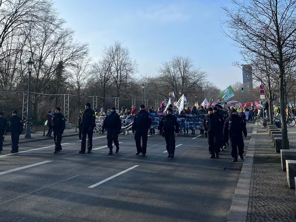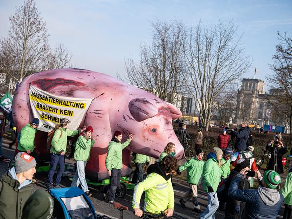 Bereits am Vormittag hatten Tierschützer ein riesiges rosa Kreuz aus Demobanner-Stoff vor dem Kanzleramt auf dem Boden ausgebreitet – als Zeichen gegen industrielle Massentierhaltung. Verschiedene Tierschutzorganisationen würden mit dieser Symbolik einen Wandel im Umgang mit „Nutztieren“ fordern, erklärte Moritz Enshaie von der Tierschutzorganisation „Animals - a crime“.