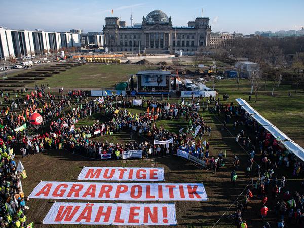 Den Organisatoren geht es um Tier-, Klima- und Umweltschutz, die Erhaltung vieler Höfe, faire Preise und gutes Essen. Ein großes Transparent auf der Wiese vor dem Reichstag forderte: „Mutige Agrarpolitik wählen“.
