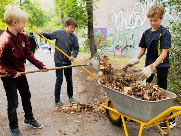 Mehr als zwanzig Kinder jäten Unkraut, pflanzen blühende Heide, sammeln Müll und Totholz, rechen Laub. „Heute gibt es ganz viele Aktionen, um unser Berlin zu verschönern“, erklärt Lehrer Frank Rudolph. „Machen wir mit.“