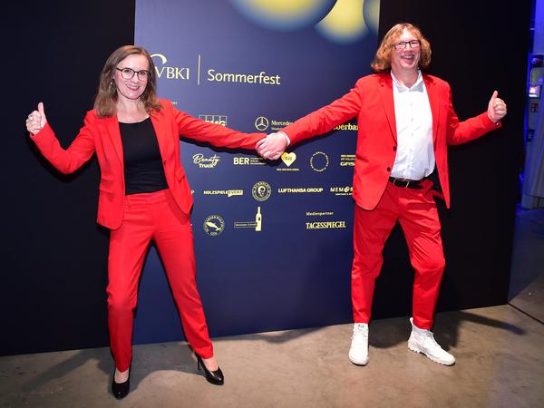 Die Vorstandsvorsitzende der DB Cargo, Sigrid Nikutta, würdigte das Ereignis auch modisch, indem sie mit ihrem Mann im Partnerlook erschien. Beide trugen feuerrote Hosenanzüge, allerdings nicht aus dem Atelier von Designerin Nanna Kuckuck, die selbst eine Kreation aus Rot und Pink mit einem Statement-Collier spazieren führte.