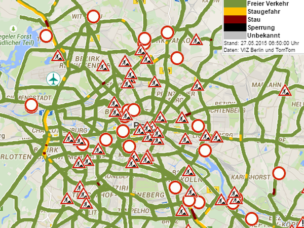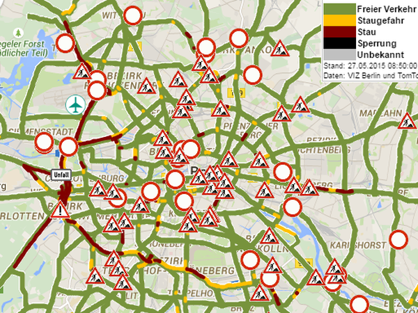 Auf den westlichen Abschnitten der A100 sowie auf der Strecke aus Tegel stadteinwärts staut es sich ebenfalls.