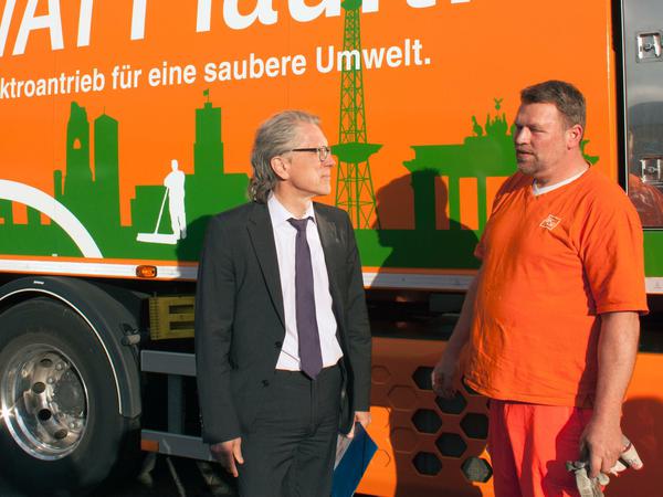 9.59 Uhr - Antrittsbesuch auf dem Betriebshof: Seit Januar ist Finanzsenator Matthias Kollatz-Ahnen schon Aufsichtsratsvorsitzender bei der BSR, heute war er zum Antrittsbesuch im Betriebshof in der Forckenbeckstraße, um "sich im Gespräch mit den Beschäftigten über Arbeitsalltag, Arbeitsbedingungen, Organisation und Abläufe informieren". Los ging's um 5.45 Uhr, eine Viertelstunde vor Schichtbeginn. Kurze Ansprache in der Kantine, dann Einzelgespräche an den Tischen. Danach in den Hof, Besichtigung eines Hybrid-Müllautos und der Biogastankstelle, Zeit für Fotos. Ende der Veranstaltung: Kurz nach halb sieben. Wer sich jetzt um die rechtzeitige Müllabholung sorgt, sei beruhigt. Die meisten Teams waren da schon lange unterwegs.