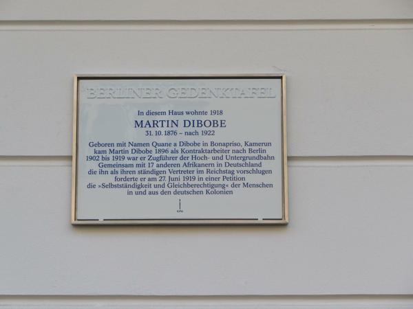 Mit einem kräftigen Zug fällt die weiße Plane von der Hauswand der Kuglerstraße 44 in Prenzlauer Berg und enthüllt die Gedenktafel für Martin Dibobe. Die Initiatoren prosten sich mit Sekt zu, die rund vierzig Zuschauer applaudieren. In der Hauptstadt hängen mittlerweile etwa 450 solcher Tafeln, dies ist die erste für einen Berliner afrikanischer Herkunft. Der Verein Berlin Postkolonial hatte die Dibobe-Tafel dem Historischen Beirat des Regierenden Bürgermeisters vorgeschlagen, der darüber entscheidet.
