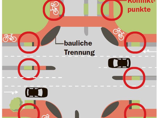 Über die Umgestaltung gefährlicher Kreuzungen wird seit dem Mobilitätsgesetz von 2018 in Berlin diskutiert, geschehen ist bislang wenig. Sogenannte Fahrradweichen aus Farbmarkierungen auf dem Asphalt haben viel Kritik hervorgerufen, da die Radfahrenden den fließenden Verkehr zur Geradeausfahrt kreuzen müssen. Einen großen Schritt weiter geht man in den Niederlanden, wo geschützte Kreuzungen mit getrennten Verkehrsströmen und kleinen Verkehrsinseln mehr Sicherheit und Übersicht geben sollen.