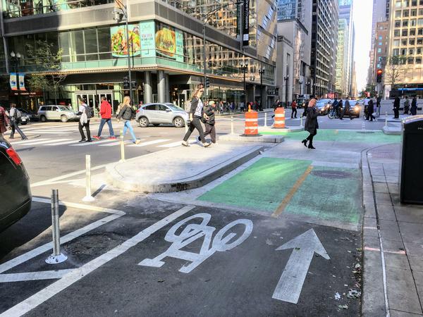 Andere Länder haben sich längst das niederländische Design abgeschaut, unten ein Beispiel aus Chicago. Durch die Verkehrsinseln können rechtsabbiegende Autofahrer die Radspur nicht schneiden. Sie müssen erst um die Verkehrsinseln herumfahren und stehen dann annährend im rechten Winkel zum Radverkehr.