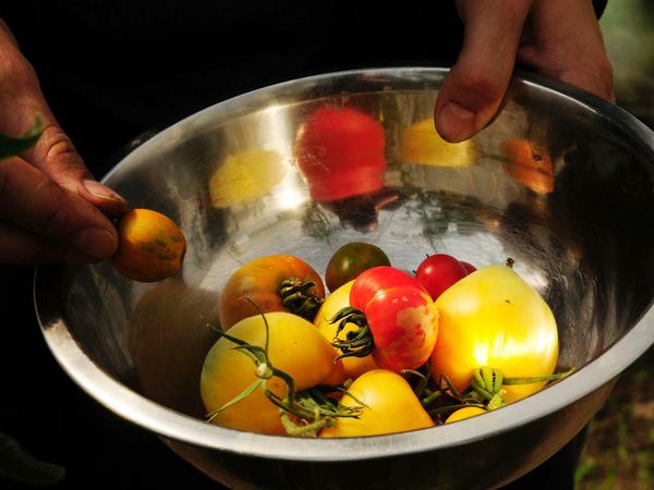 Die Gartenmelde, die Katrin David zu den Gnocchi geplant hat, ist schon zu weit, also ernten die Teilnehmer Neuseeländer Spinat. Und im Gewächshaus, einem Zelt, in dem die trockene Hitze steht wie eine Wand, lernen alle die Hautfarben der Tomaten kennen: gelb, dunkelrot, schwarz oder schwarzrot marmoriert, das „weiße Ochsenherz“ und das „grüne Würstchen“. Dort wachsen dicke gekerbte neben klitzekleinen mit zarter Schale.
