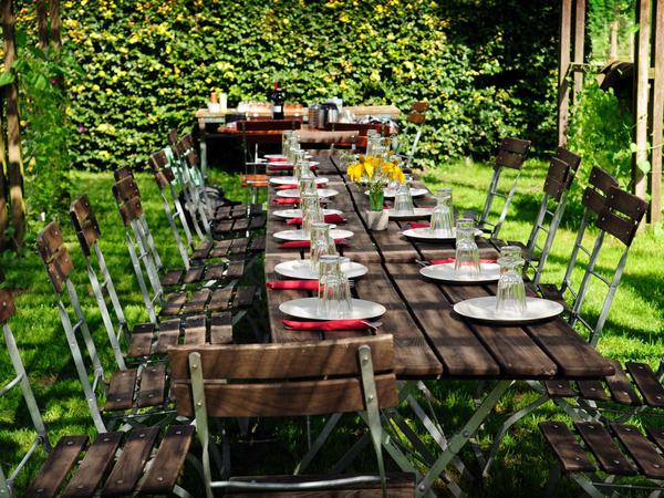 Schon seit dem Vormittag hat sie in Steinhöfel mit zwei Praktikanten alles aufgebaut rund um die große Kochstelle mitten auf der Wiese. Unterm Spalier sind die langen Gartentische mit weißem Porzellan, roten Servietten und gestürzten Gläsern eingedeckt. Zur Begrüßung reicht sie Sekt mit Holunderblütensirup, Bruschetta und Wassermelone mit Käse, da fühlen sich Gäste gleich willkommen. Sie werden Brotsalat in tausend Gemüse- und Blütenfarben zubereiten, Gnocchi mit Pecorino, auf römische Art geschmorte Keulen vom Freilandhähnchen und zum Gartenfrüchtesalat frisch gebackene Cantuccini mit Vin Santo knabbern.