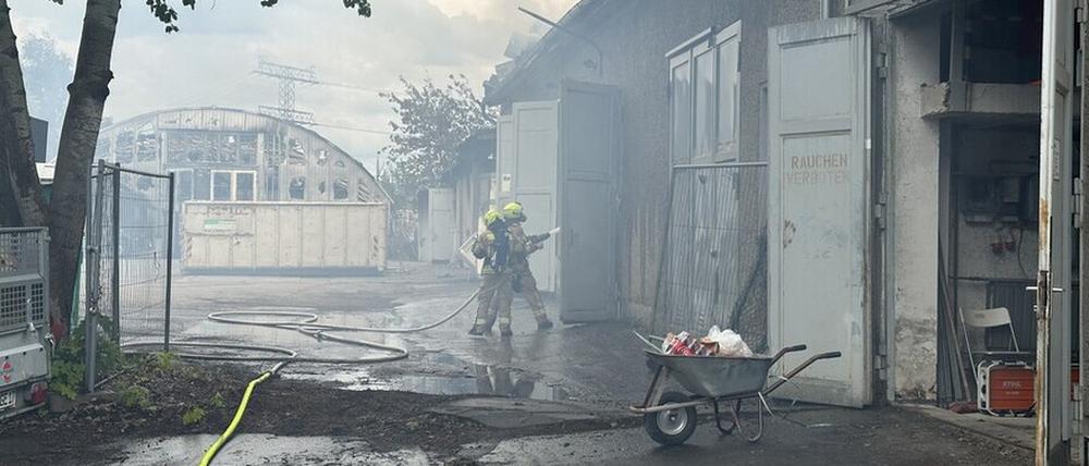 Bereits in der Nacht zu Montag löschte die Feuerwehr einen Großbrand in einer Lagerhalle im Pyramidenweg. Jetzt brannte es dort erneut. Das Gebäude ist einsturzgefährdet.