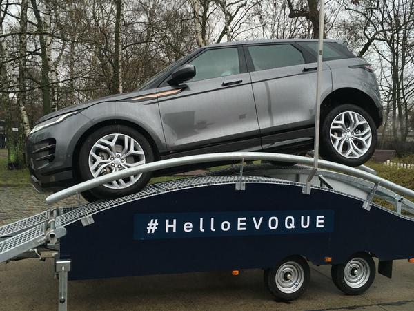 Wenn der Prophet nicht zum Berg kommt, muss der Berg eben zum Propheten kommen – oder in diesem Fall zum Autofahrer. Kein Hügelchen weit und breit, an dem sich die Geländetauglichkeit des neuen Range Rover Evoque vorführen ließe, nur der Parkplatz der ehemaligen, zur Event Location mutierten Brückenmeisterei nahe dem Berliner Westhafen. Macht nichts, es gibt ja mobilen Ersatz: ein Anhänger mit künstlicher, aus Metallrohren und -gittern zusammengeschraubter Erhebung. Sieht harmlos aus, nur laufen die beiden „Reifenspuren“ zwar parallel, doch als gegenläufige Wellen über den silbrigen Huckel. Für den Off-Road-Anfänger wird das schnell zum Problem. Immerhin, das Gas war richtig dosiert, die Räder haben beim Aufstieg nicht durchgedreht. Aber jetzt schwebt das linke Hinterrad abenteuerlich in der Luft, der Wagen scheint aus der Spur zu geraten. „Gegenlenken!“ rät sein Gefühl dem Laien, „Lenkrad gerade!“ drängt, nun doch etwas nervös, der Profi-Beifahrer – ein kurzer Moment von Ratlosigkeit, dann sind wir drüber. Nicht jedermanns Sache, dieses Off-Road-Geschaukel.