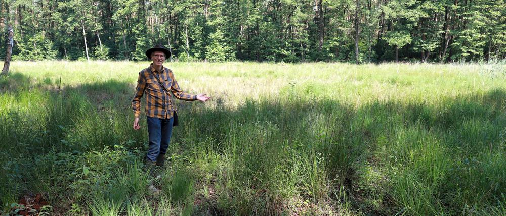 Krumme Laake, nie gehört. Das muss sich ändern. Landschaftsplaner Justus Meißner wartet bereits am verabredeten Treffpunkt im Stadtteil Berlin-Müggelheim, Duchrother/ Ecke Staudernheimer Straße. Ein paar Schritte, schon sind wir im Wald. Unter hohen Kiefern wuchert es in satten Grüntönen. Der Regen hat der Natur gut getan. Herrlich.