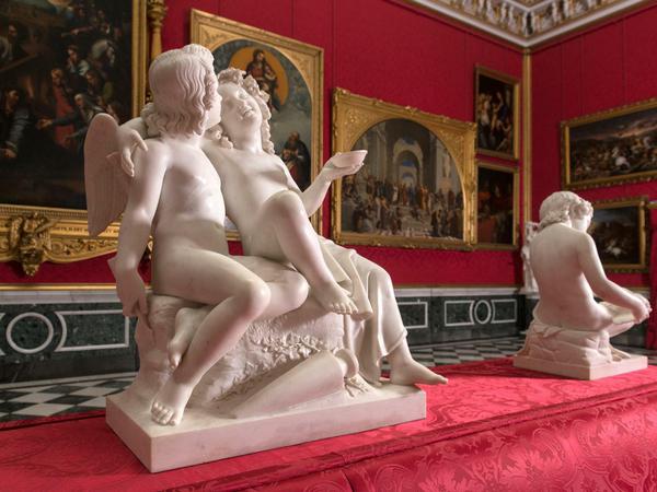 Zeit der Engel. Aber wo sind sie? Im Marmorsaal von Schloss Sanssouci etwa drängeln sich die himmlischen Wesen, manche in strahlendem Weiß, andere glänzend vergoldet. Wie international bei Hofe üblich, wünschte auch Friedrich II. eine üppige Raumausstattung für seine Sommerresidenz. Putti machen sich auch in der dortigen Gemäldegalerie auf den wertvollen Leinwänden breit. Peter Paul Rubens etwa malte, vermutlich um 1610, den heiligen Hieronymus. Der Kirchenvater sitzt grübelnd da, überlegt wohl, was er in das dicke Buch vor sich schreiben soll. Aber womit? Ein gelockter Engelsbube hält einen neuen Federkiel bereit und prüft pustend, ob der wohl die Tinte halten wird.