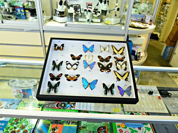 Seit 1972 sind die rund 100 Schaukästen nun im Schöneberger Geschäft ausgestellt. Im Laden selbst gibt es nicht nur Mikroskope, Laborbedarf oder Chemiekästen zu kaufen, sondern auch weitere präparierte Tiere wie Vögel aus Zoo und Tierpark, Kröten oder einen jungen Fuchs.
