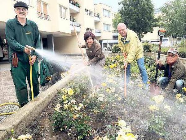Ab ins Beet. Mit Gärtner Heinrich Fust (links) pflanzen Hans-Rudolf Tosch, Gudrun Rahm, Joachim Rauschenbach am Mehringplatz. 16 Beete sind zu pflegen.