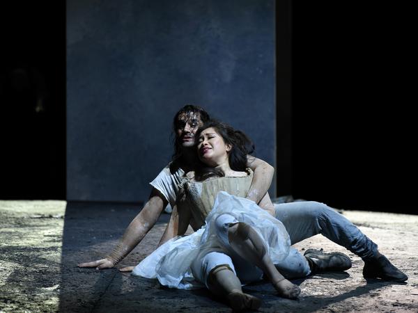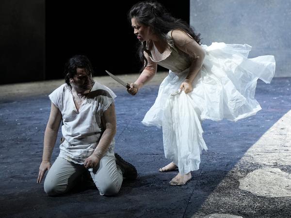 Nichts geht unter die Haut, noch nicht einmal das wüste Gemetzel, an dem sogar eine akrobatische Kampfgruppe der Stunt-Factory mitwirkt. Da spritzt eimerweise Kunstblut, wird aus der Tragödie eine Klamotte. Dazu passt es, dass die Damen des Prager Philharmonischen Chors in Liebestötern um die Protagonisten herumwieseln und Elvira im zerfledderten Unterrock mehr einer Vogelscheuche gleicht als einer Braut. Als Virtuosin anspruchsvoller Koloraturen nimmt die Chinesin Guanqun Yu jedoch für sich ein, an leisen Stellen gelingen ihr Momente von großer Zärtlichkeit.