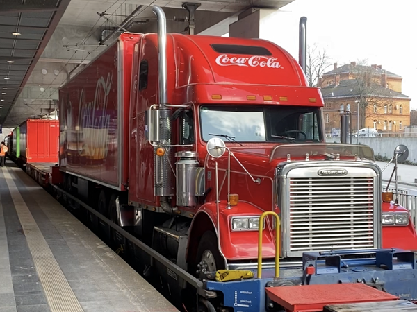 Werbekampagne der DB Cargo und Coca-Cola: Am Bahnhof Südkreuz fährt zum ersten Mal der Coca-Cola-Truck auf einem Güterzug ein.
