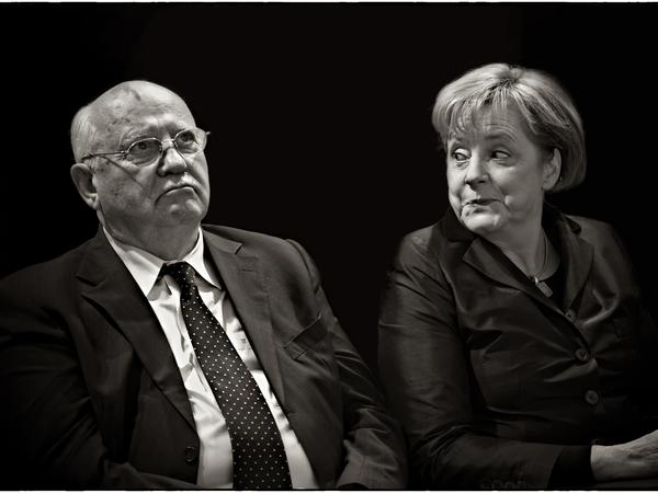 Ihm steht die Skepsis ins Gesicht geschrieben, sie schaut etwas amüsiert. Die 60 mal 80 cm große Schwarz-Weiß-Aufnahme von Fotografin Monika Schulz-Fieguth, aktuell zu sehen in der a/e Galerie, zieht die Betrachter umgehend in ihren Bann. Bei den Protagonisten des beeindruckenden Doppelporträts von 2009 handelt es sich um Michail Gorbatschow, den inzwischen verstorbenen Präsidenten der Sowjetunion, und um Ex-Kanzlerin Angela Merkel.