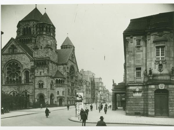 1938 wurde sie von Nationalsozialisten in Brand gesetzt, später abgerissen: Projizierte Bilder des alten Baus an den neuen Fassaden erinnern an das damalige Pogrom.