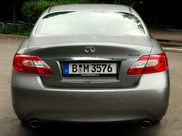 Sportlich kommt er daher, der M35h. Die Schürze vorne tief nach unten gezogen und die Kotflügel weit ausgestellt. Auch auf der Haube spannt er über den Radhäusern die Muskeln. Nach hinten wird das Auto braver, seine coupéhafte Dachlinie findet Ihren Abschluss in einer dezenten Andeutung einer Abrisskante über dem Kofferraum. Die Linienführung ist insgesamt sanft und geschwungen. Das Modell hat Stil, keine Frage.