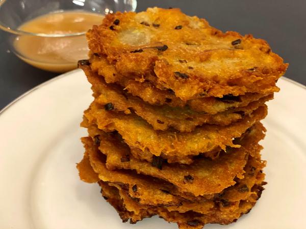 Auf einem Küchentuch das Fett abtropfen lassen, und das Ganze heiß mir Apfelkompott oder mit Räucherlachs servieren.