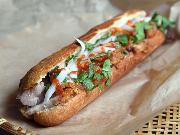 „109, Schweinebauch scharf!“, ruft die Frau an der Theke im „Banh Mi Stable“ in Berlin-Mitte nach 20 Minuten. Das Sandwich ist fertig. Der gegrillte, hauchdünn geschnittene Schweinebauch ist so knusprig wie das getoastete Baguette, statt Koriander ist Minze drin, außerdem eingelegter Daikon-Rettich und Karotten. Mayo gibt dem Ganzen eine cremige Bühne. Beißt man hinein, kann man den Aufruhr in der Mensa im Oberlin College verstehen. Ein Banh Mi kann einfach sensationell schmecken – wenn man sich die Zeit nimmt, es richtig zu machen.
