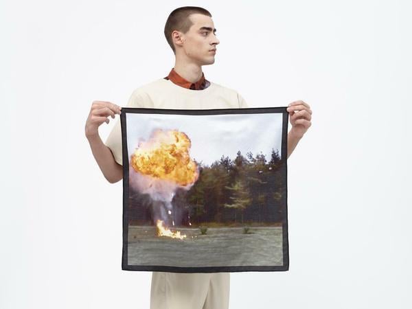 Aber Verena Schepperheyn arbeitet mit etwas völlig anderem, oder um mit Monty Python zu sprechen: „And now for something completely different!“ Sie hat sich den Sketch „How not to be seen“ vorgenommen, in dem es darum geht, wie man nicht gesehen wird und wie man sich in einer trostlosen, verregneten Landschaft versteckt. Das gelingt im Sketch natürlich keiner der Testpersonen, sie werden allesamt in die Luft gesprengt. Genau diese Explosion hat Schepperheyn auf den Hemden, T-Shirts und Tüchern als Muster verarbeitet. Dazu kommt ein Wollschal, in den der Satz „How not to be seen“ eingestrickt ist.